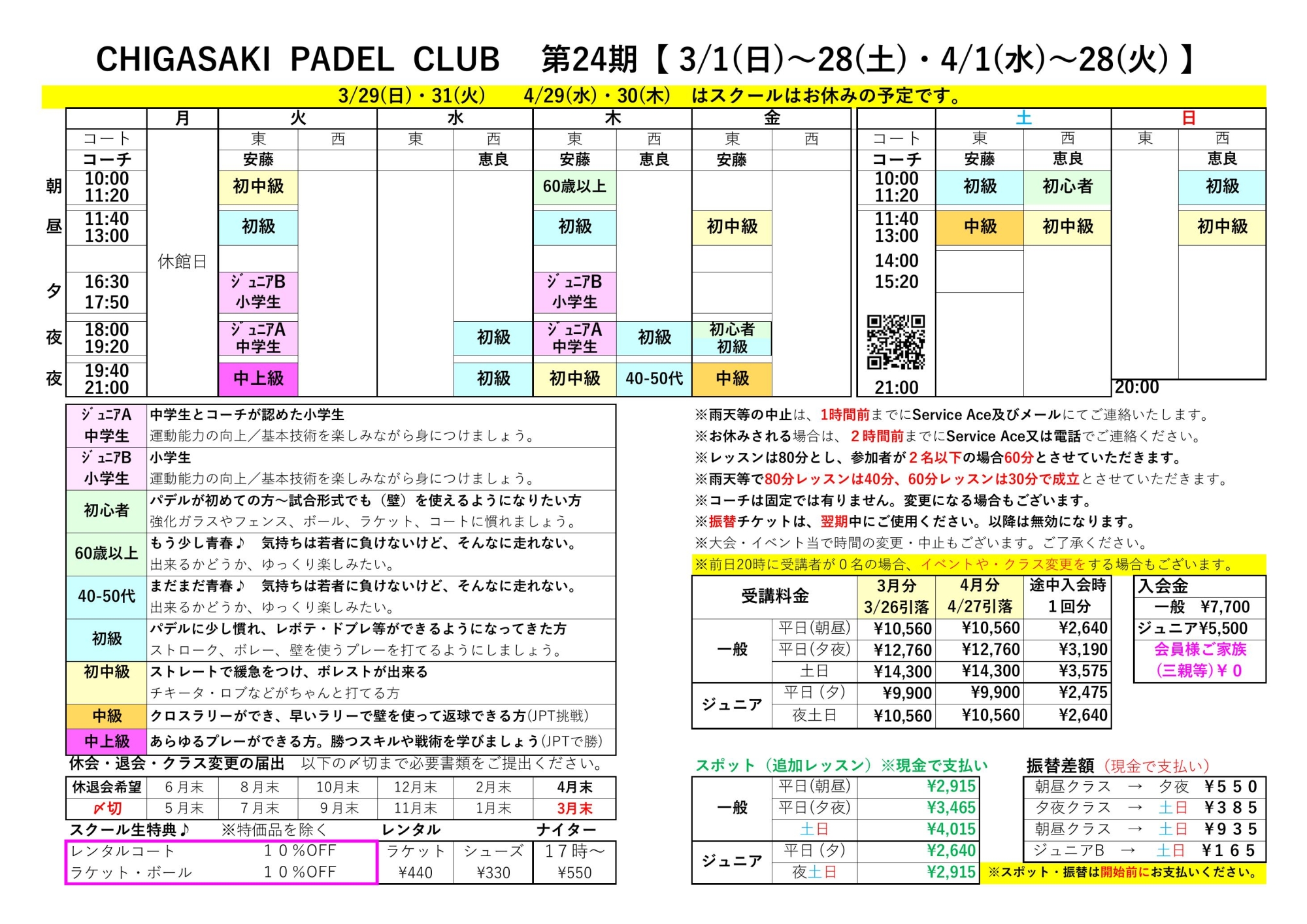 スクール数が多い日、昼休み等はコーチの健康・体力維持のため、お受けできない場合がございます。予めご了承ください。